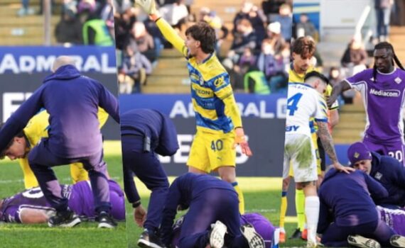 Attimi di apprensione dopo uno scontro di gioco. Il giocatore poi si rialza e riceve la bella reazione dagli spalti Fonte