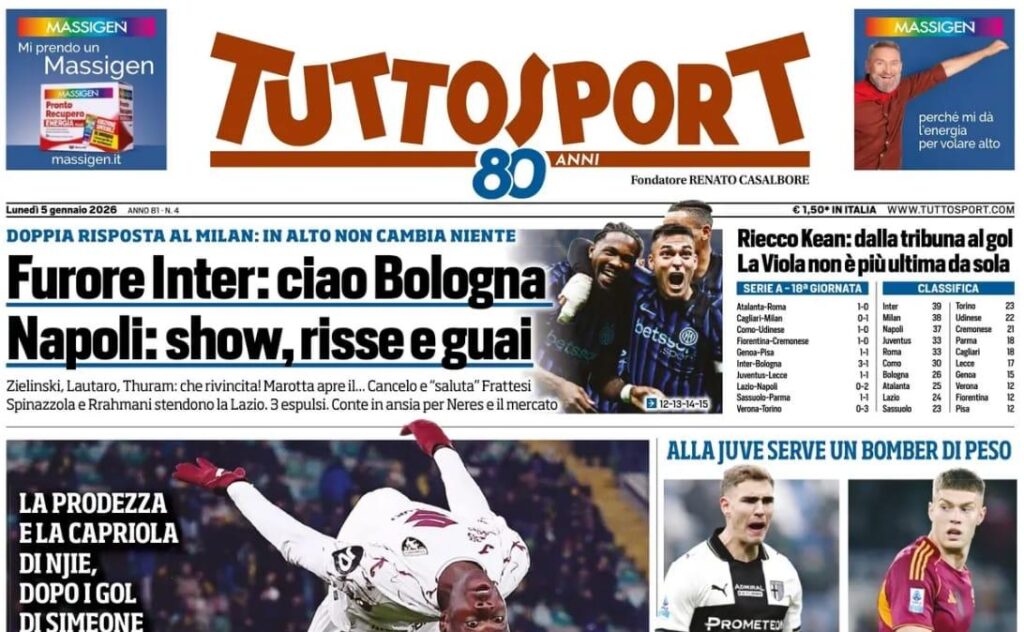 Finisce in parità la prima di Dossena sulla panchina del Novara. Tuttosport apre lo spazio dedicato alla Serie C con il match di Monza: "L’Inter Under 23 non sa più vincere: sesta gara senza i tre punti per i nerazzurri.